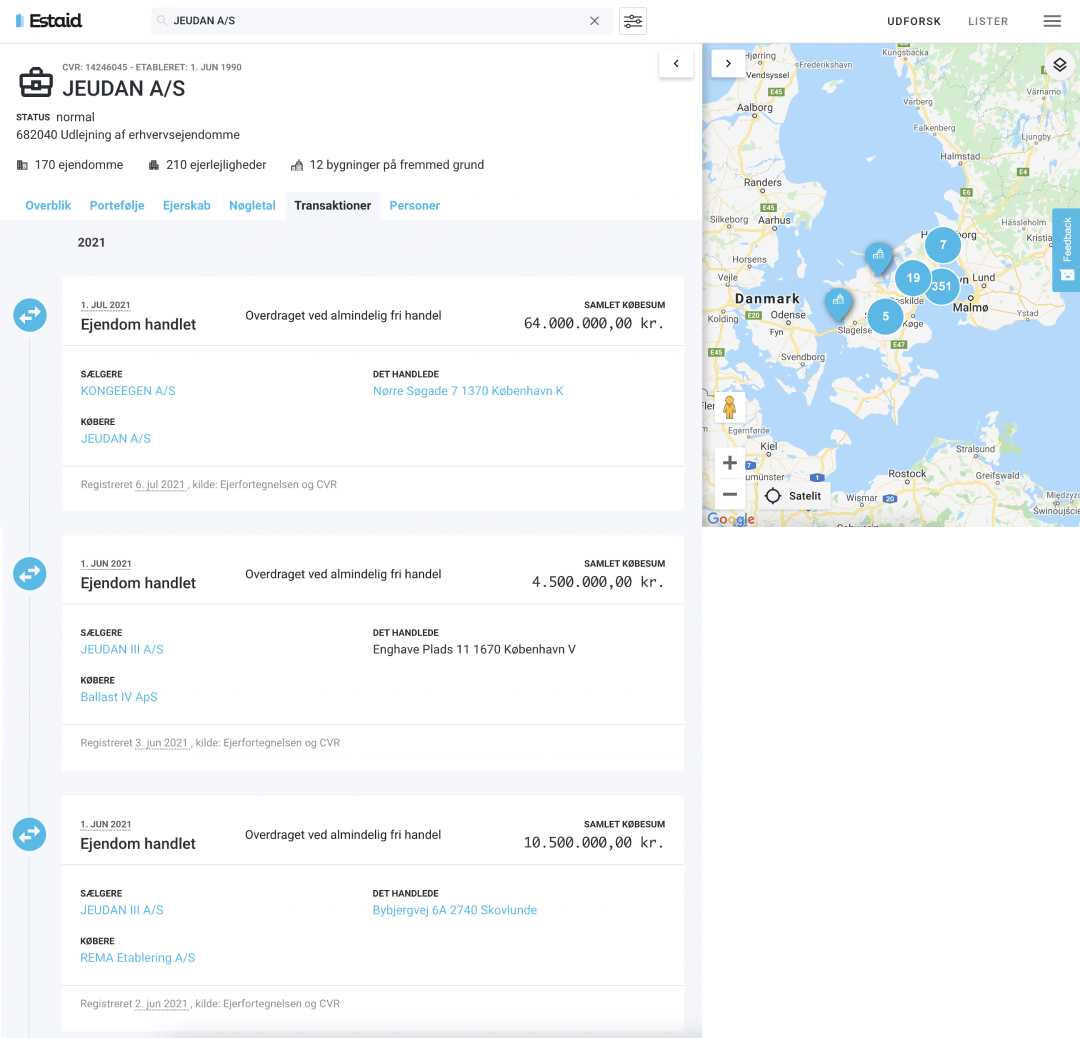 Du kan også se alle tinglyste ejendomshandler under ets elskab (og dets datterselskaber) på tværs af den samlede portefølje.