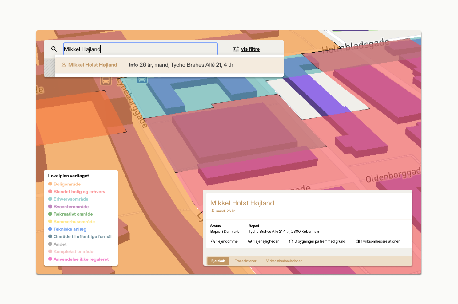 Da det nu er muligt at fremsøge personer i vores søgefelt, åbner det op for at du kan undersøge personer der ejer en eller flere ejendomme. Du søger ved at skrive navnet på den person du ønsker at undersøge i søgefeltet, dernæst kan du se hvilke ejendomme personen ejer og se de seneste transaktioner, som personen har været en del af.